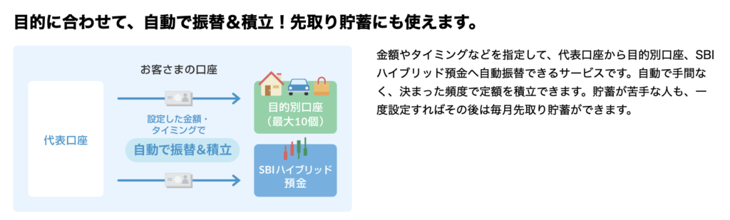 目的別口座があり、定額自動振替を行うことで勝手にお金が貯まる仕組みを作ることができます。
