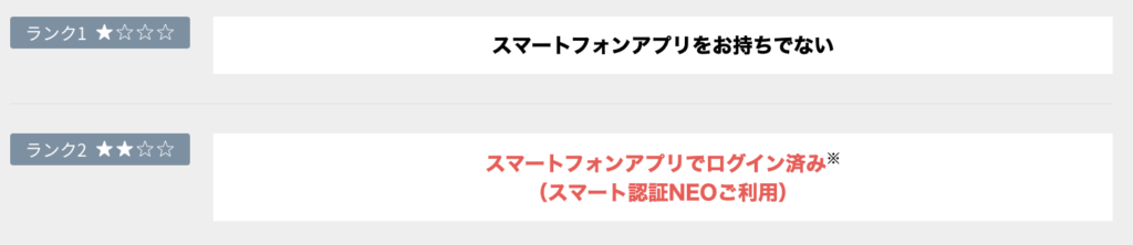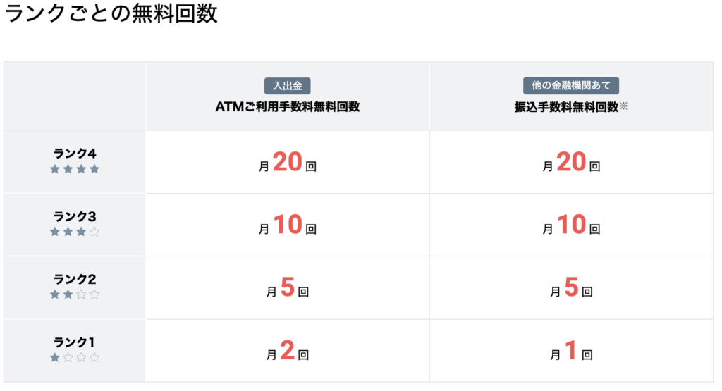 「スマホを持っており、生体認証(指紋や顔認証)の設定をしている」のであれば「ランク2」なので月5回まで振込手数料が無料です。