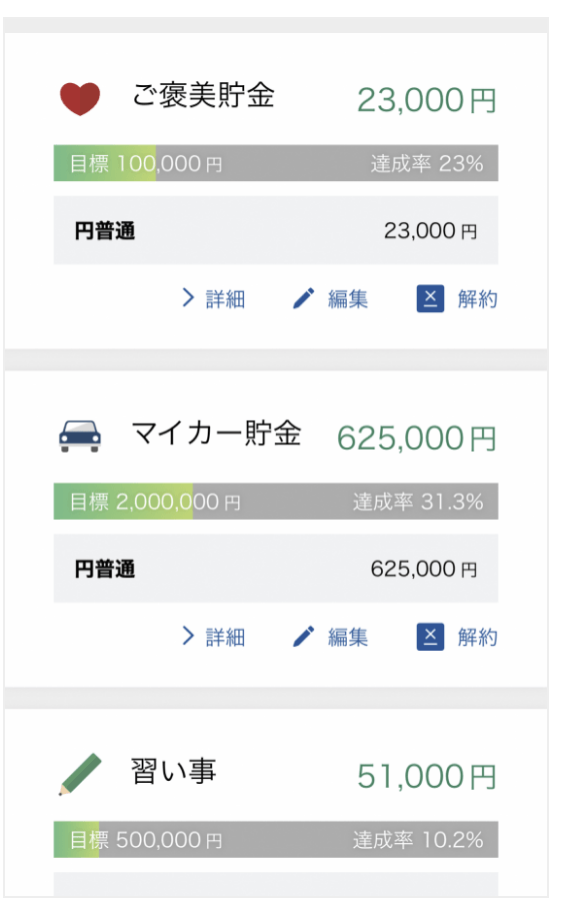 - 旅行や特別費用など「使い道ごと」に積立ができる