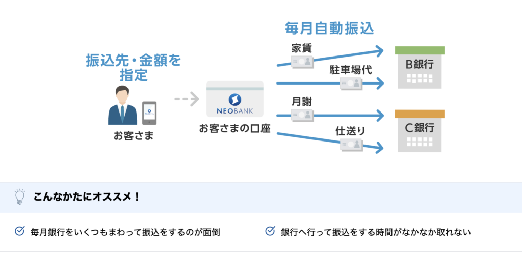 - 家賃や仕送りなどを毎月自動で振込できるサービス