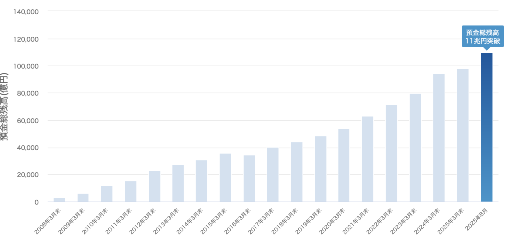 預金総残高は伸び続けており、これからも伸び続けそうな勢いです。そして、2025年8月5日に預金残高11兆円突破したというからすごいですね。