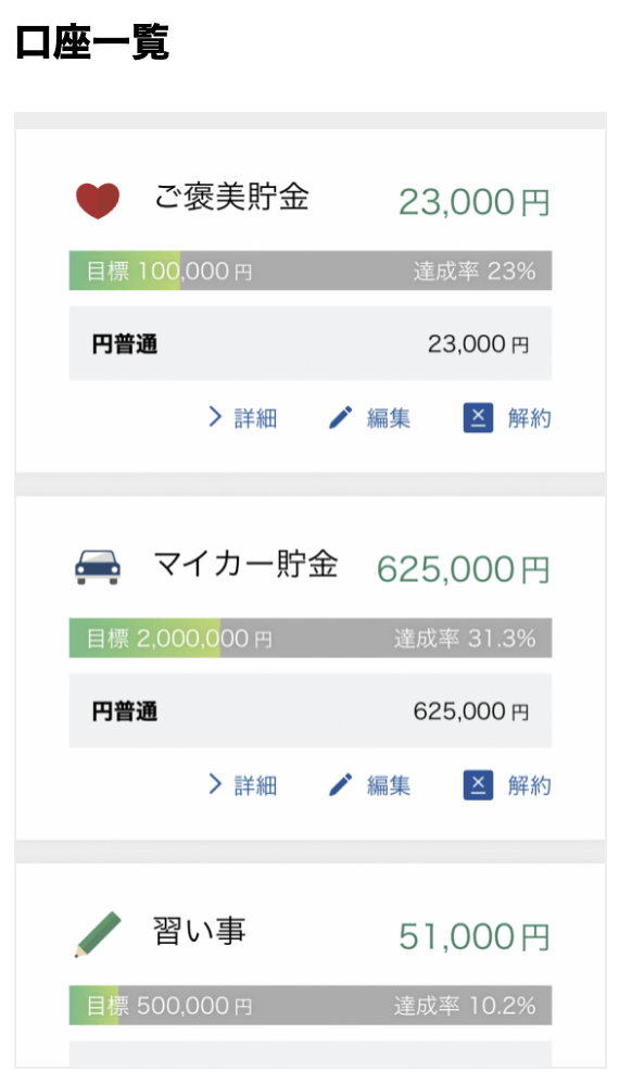 1️⃣目的毎に貯金できる(目的毎に口座を10個まで作成できる)