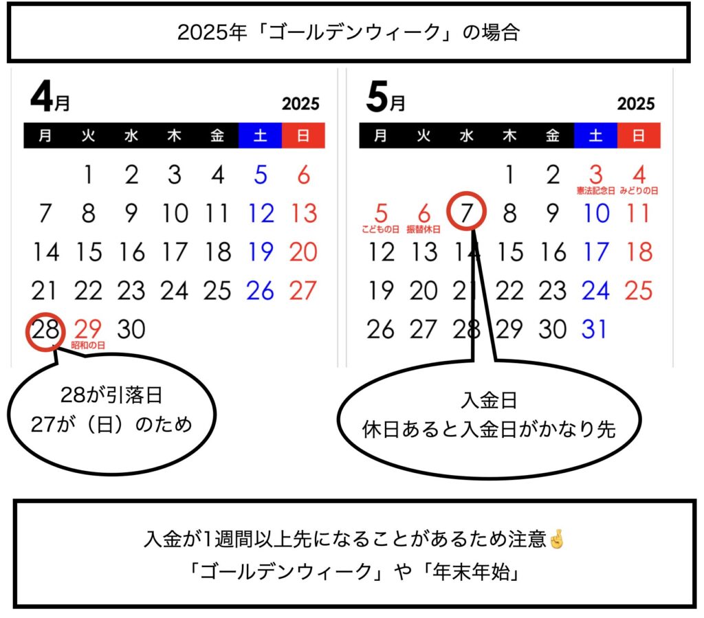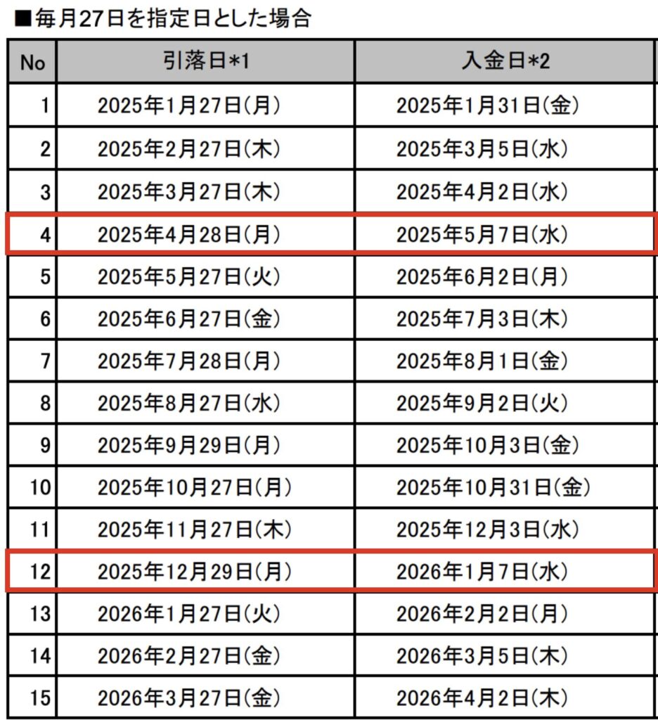 2025年の引落日と入金日の一覧は以下のとおりです。