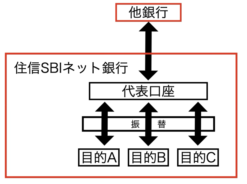 また、目的別口座からほか銀行へは出金できず、「代表口座」を経由して他銀行とのやり取りをします。