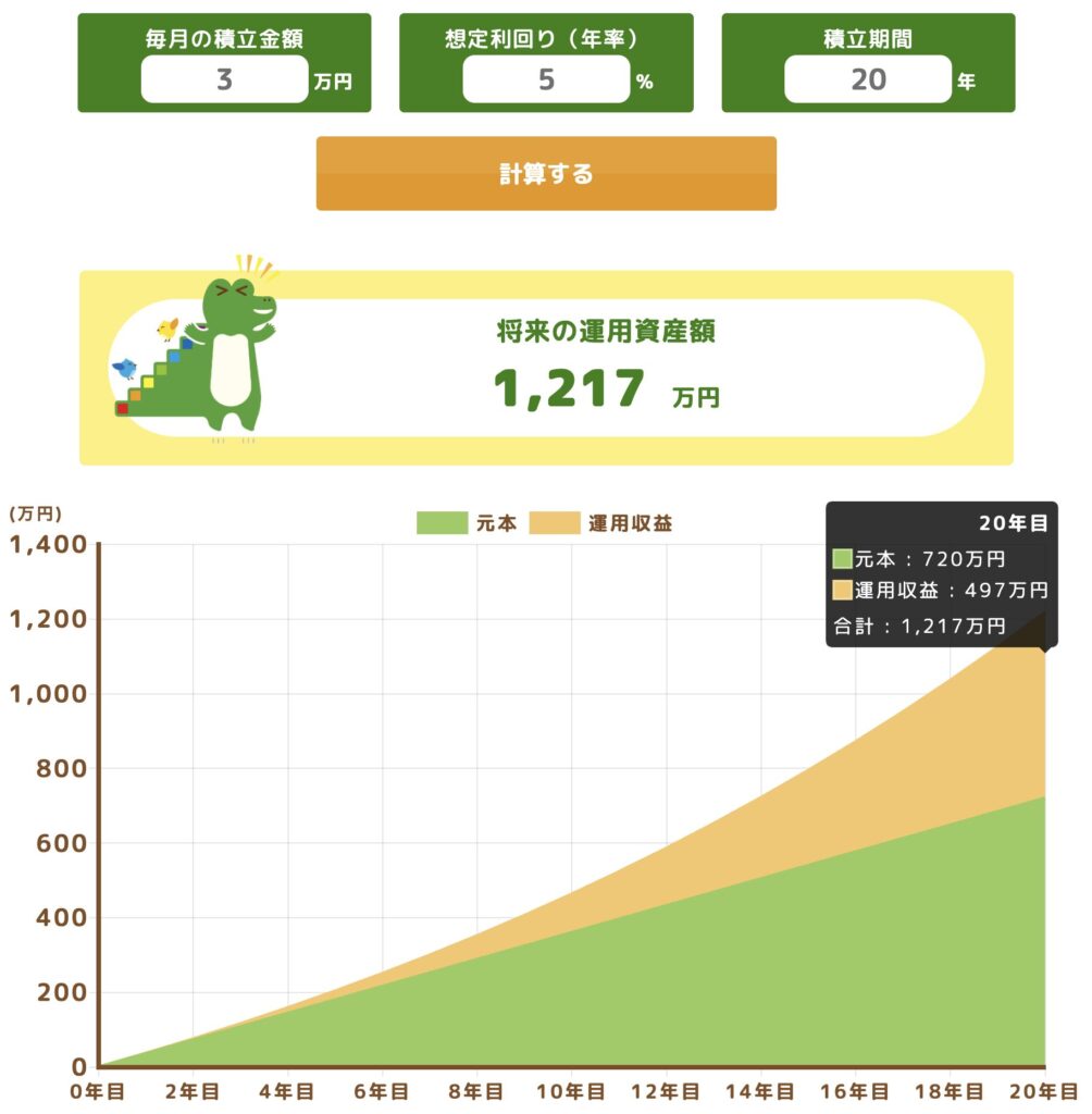 例えば、毎月3万円を20年間、年利5%で積み立てた場合、運用益は約500万円です。
