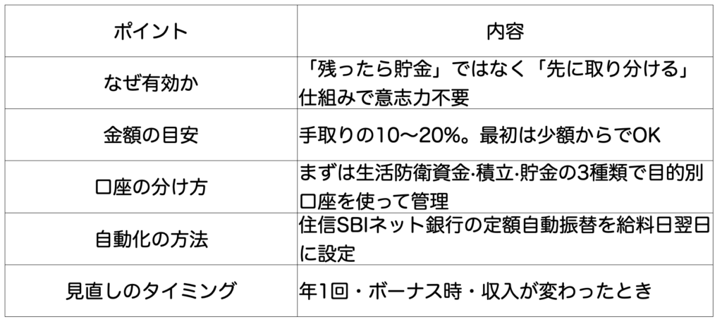 まず生活防衛資金の先取りを優先し、確保できたら余裕分を投資に回す順番を守りましょう。