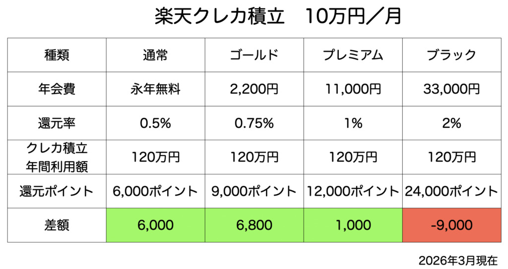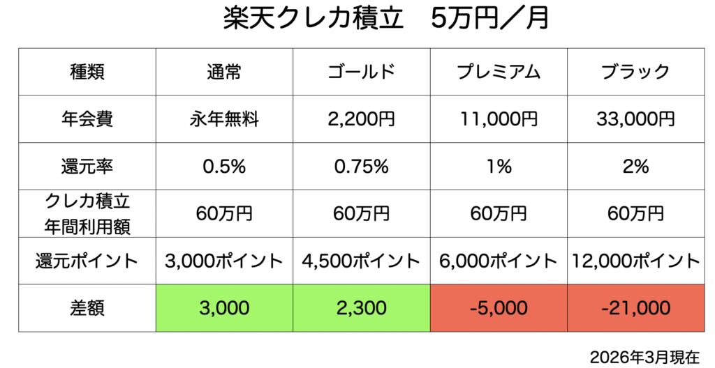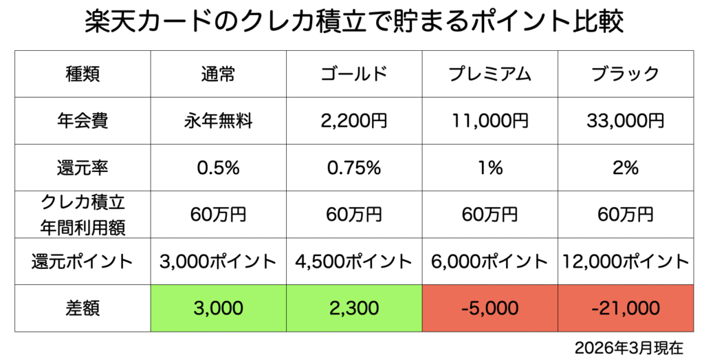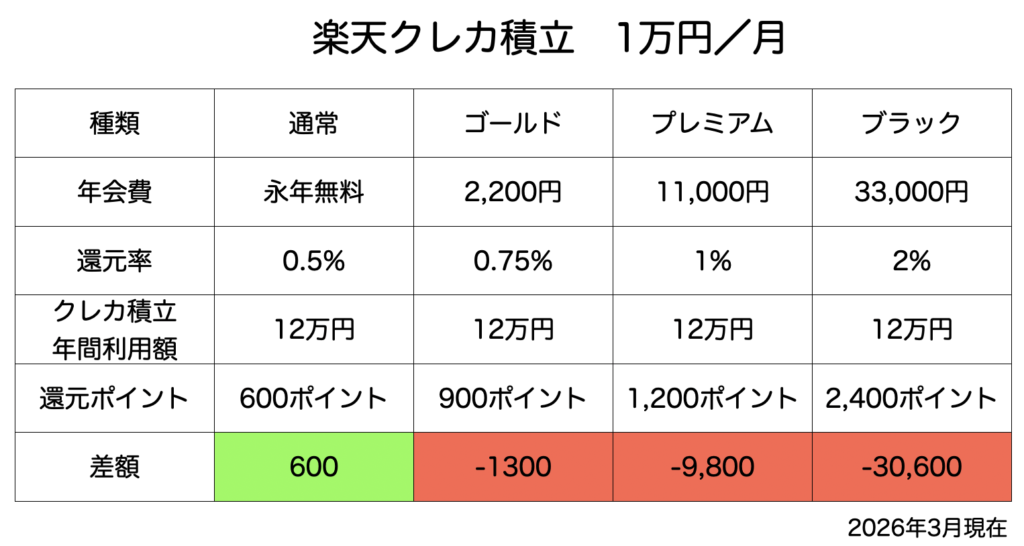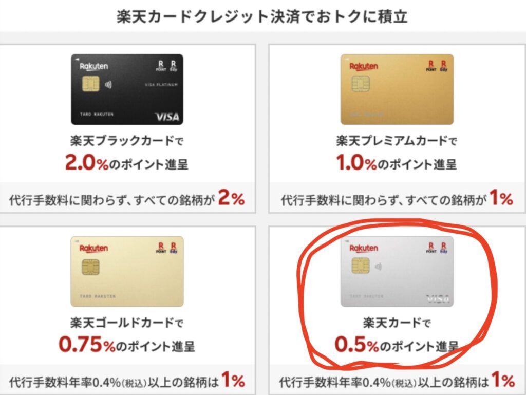 なんと、毎月クレカ積立する場合は「通常の」楽天カードに軍配があがりました。
