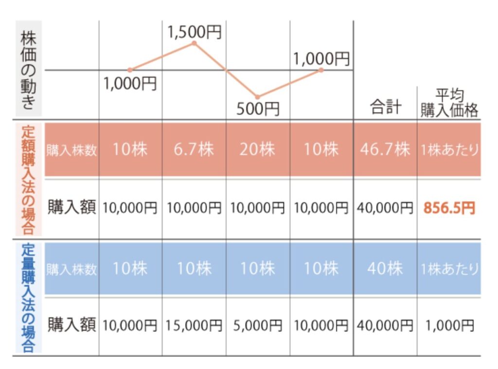 このように定額で買う(毎月1万円)か定量(毎月10株)で買うかで長期でみると購入価格が変わってきます。
