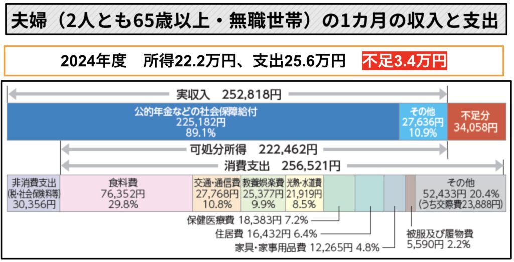 総務省家計調査年報2024年のデータをみると不足は3.4万円です。