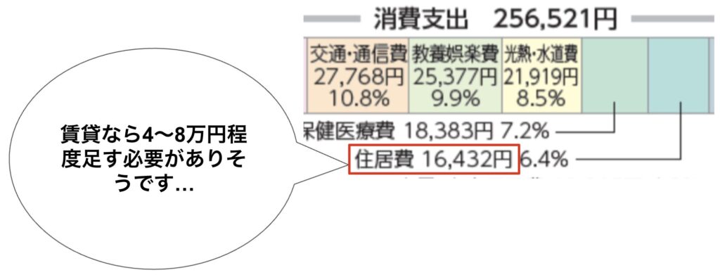※住宅ローン完済している方は住居にお金がかかりませんが、維持費として1〜2万円程度毎月かかると推測できます。(新築時から毎月積み立てていると想定してこのくらいかかるでしょう)