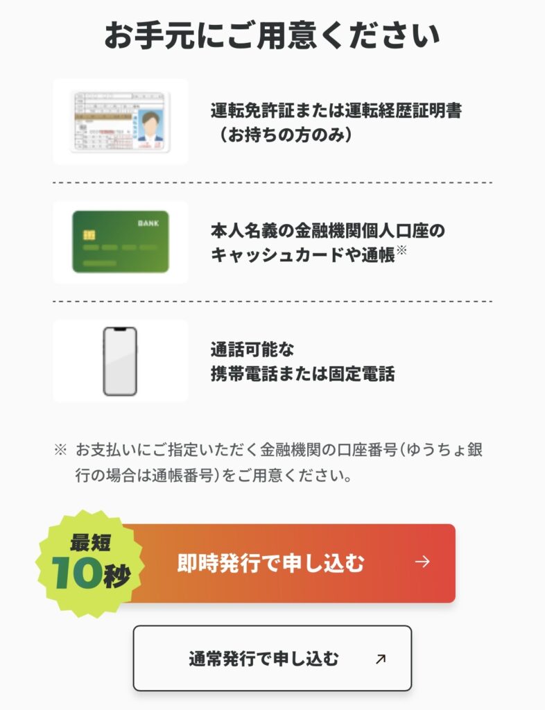 申し込みページにアクセスしたら「即時発行で申し込む」もしくは「通常発行で申し込む」を選択してください。