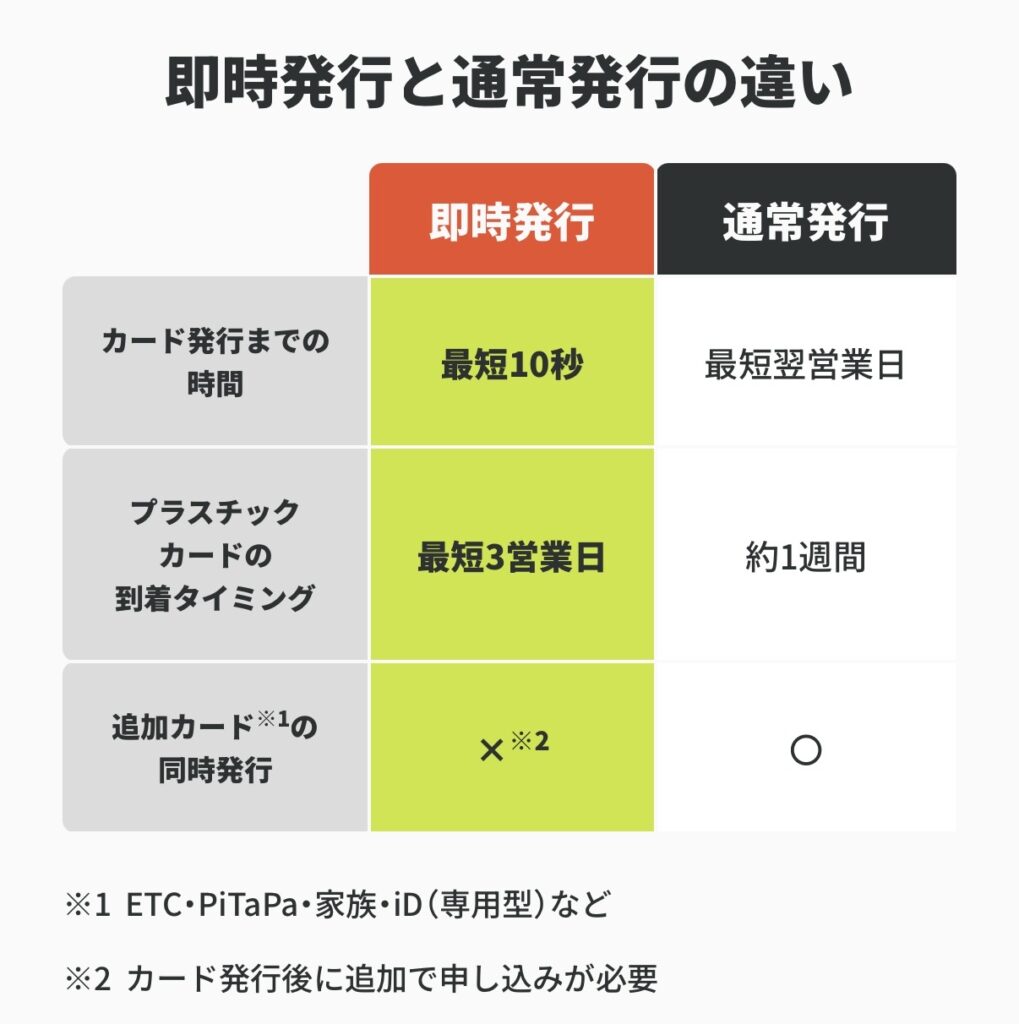 A:9:00~19:30の間に申し込んだ場合、即時発行サービスが利用できればアプリ上のカード番号をすぐ使えます。19:31以降の夜間帯に申し込んだ場合は利用枠5万円·1回払いのみという制限付きで即時発行されます。