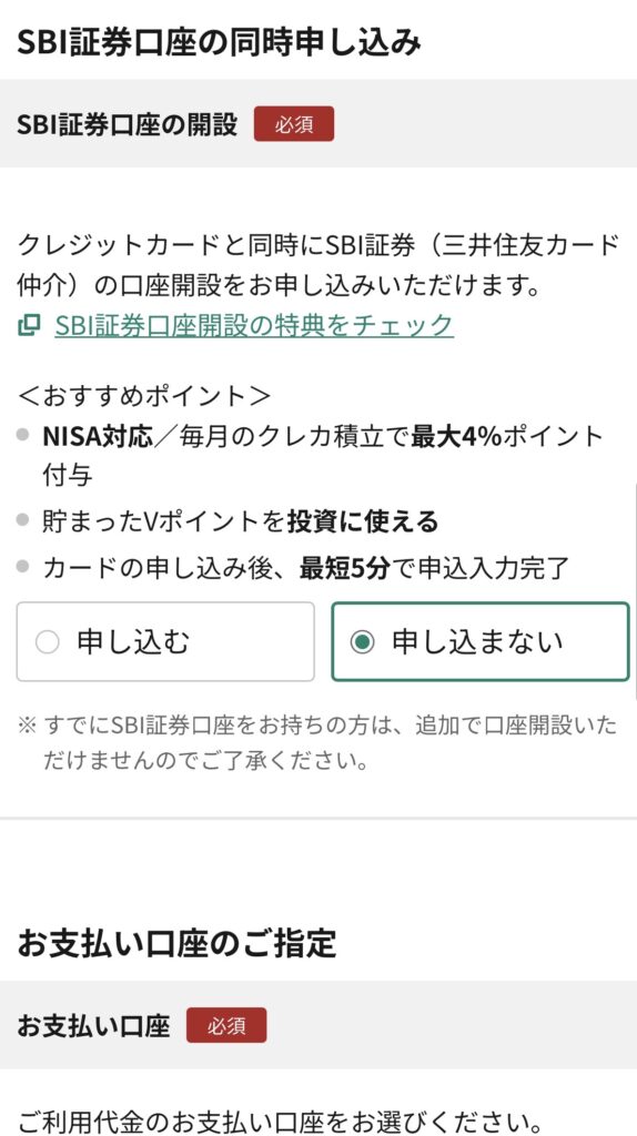 SBI証券口座の同時申し込みもできますが、なかなか手間がかかるので余裕がなければ後回しでもOKです。