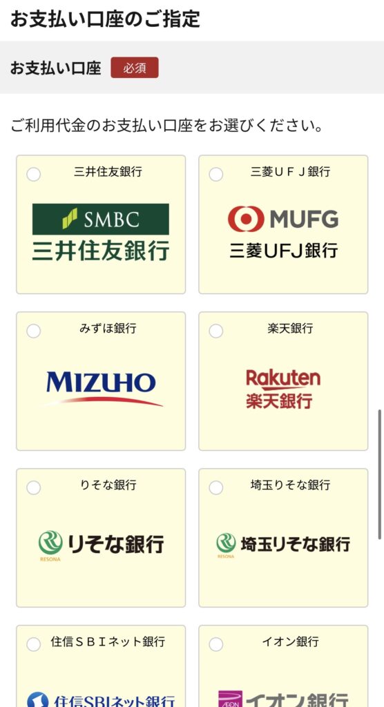 毎月の支払いを引き落とす銀行口座を設定します。