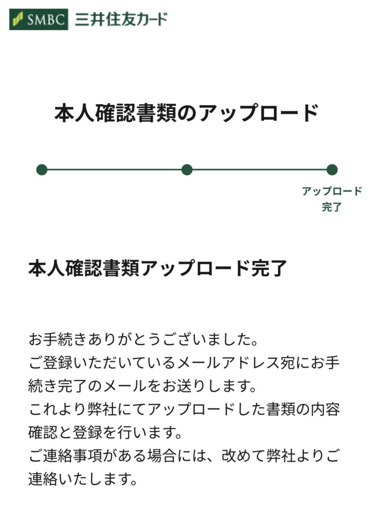 入力内容を確認して送信すると申し込みが完了します。その後、三井住友カードから本人確認書類の受付完了メールが届きます。あとは審査結果を待つだけです。