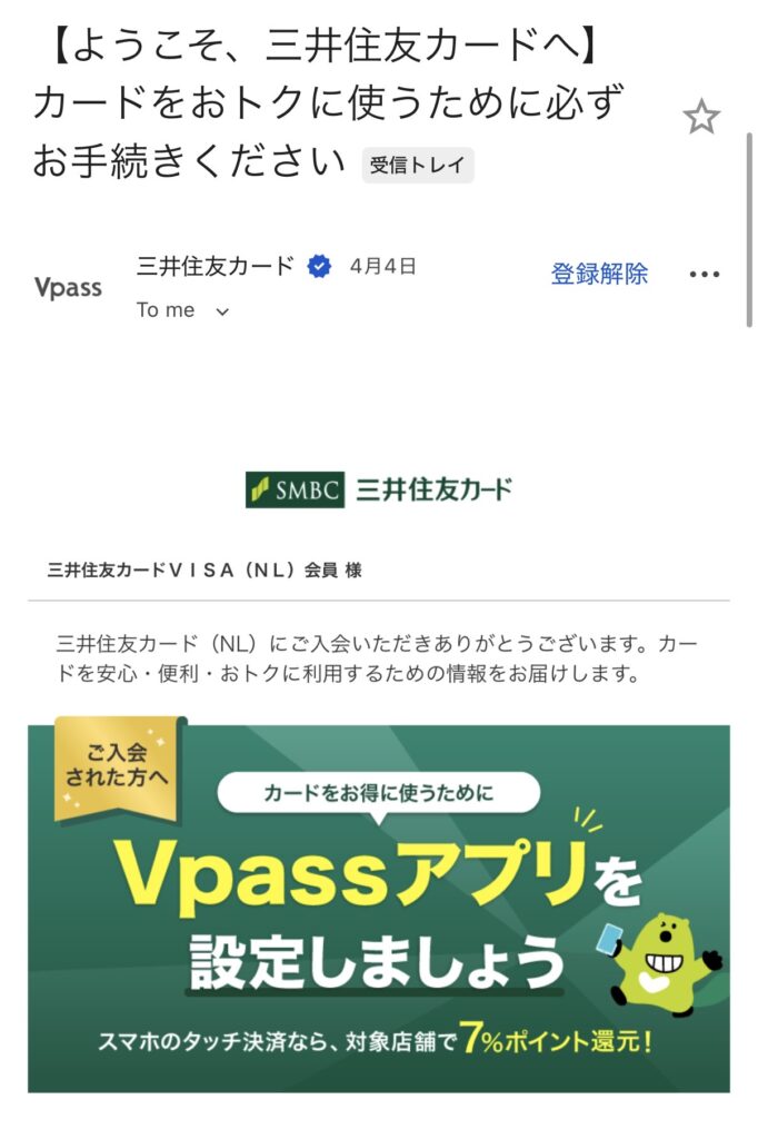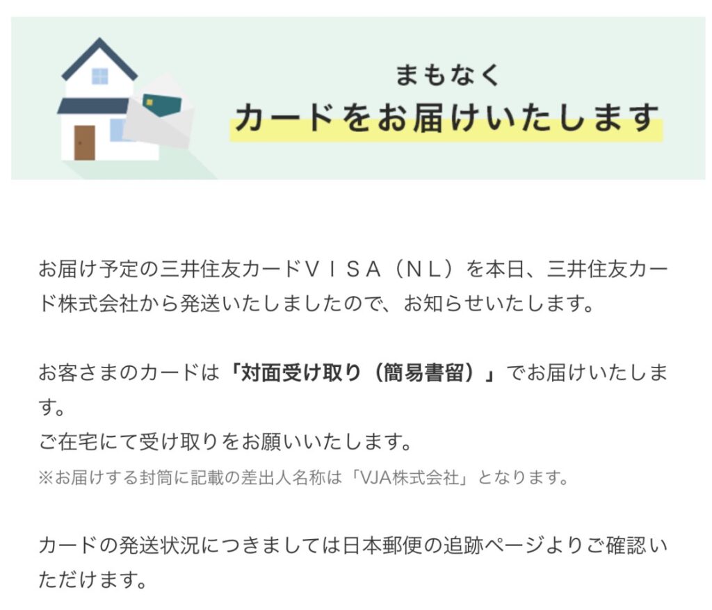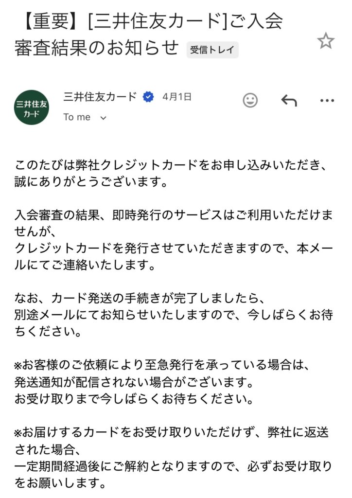 4日後には以下の通り、三井住友カード(NL)の発送通知がメールで届きました☺️