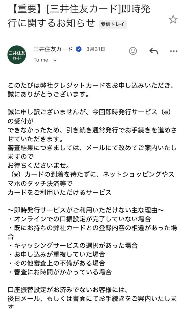 筆者の場合は夜間申し込みで、翌営業日の16時18分に審査結果のメールが届きました。即時発行されないことは申し込み12分後に通知されていましたし、通常発行は翌日中には審査結果がわかったので、それほど待たされた印象はありませんでしたよ☺️