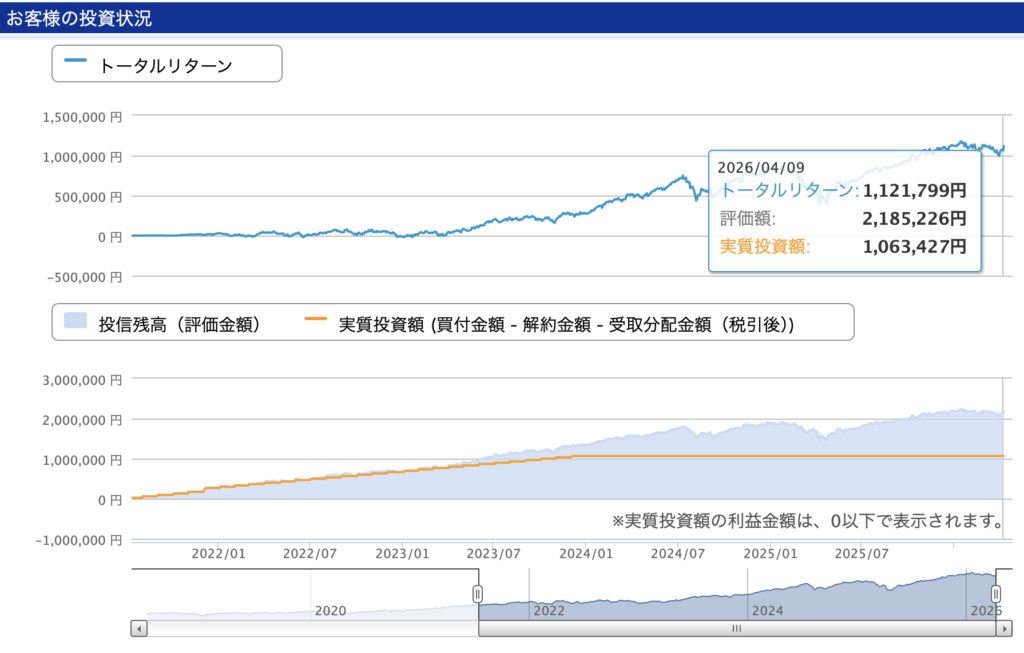 市場の上下を気にせず、クレカ積立で淡々と買い続けた記録が、そのまま利益になっていた。