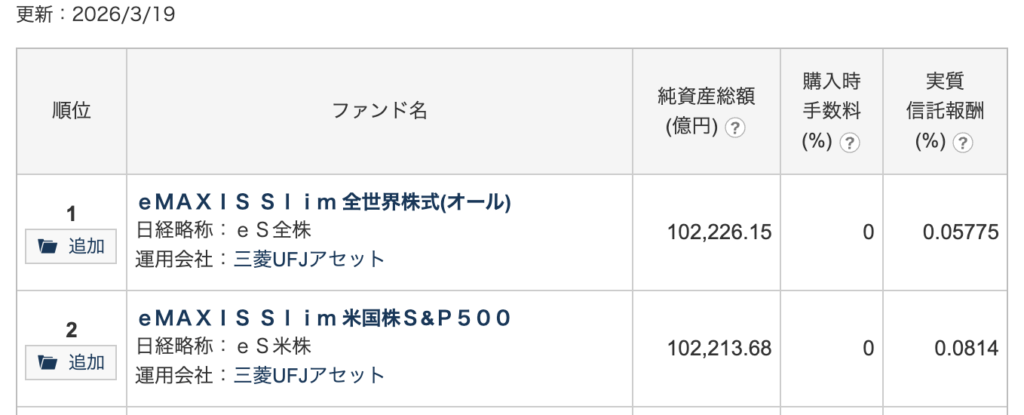 • 純資産が多い:純資産が多いと信託報酬が下がりやすいです。投資する手間は変わらないので、ファンド側は純資産が大きくなるほど、信託報酬を下げやすくなります。