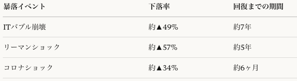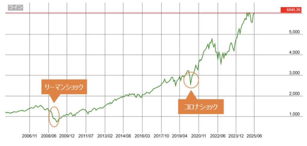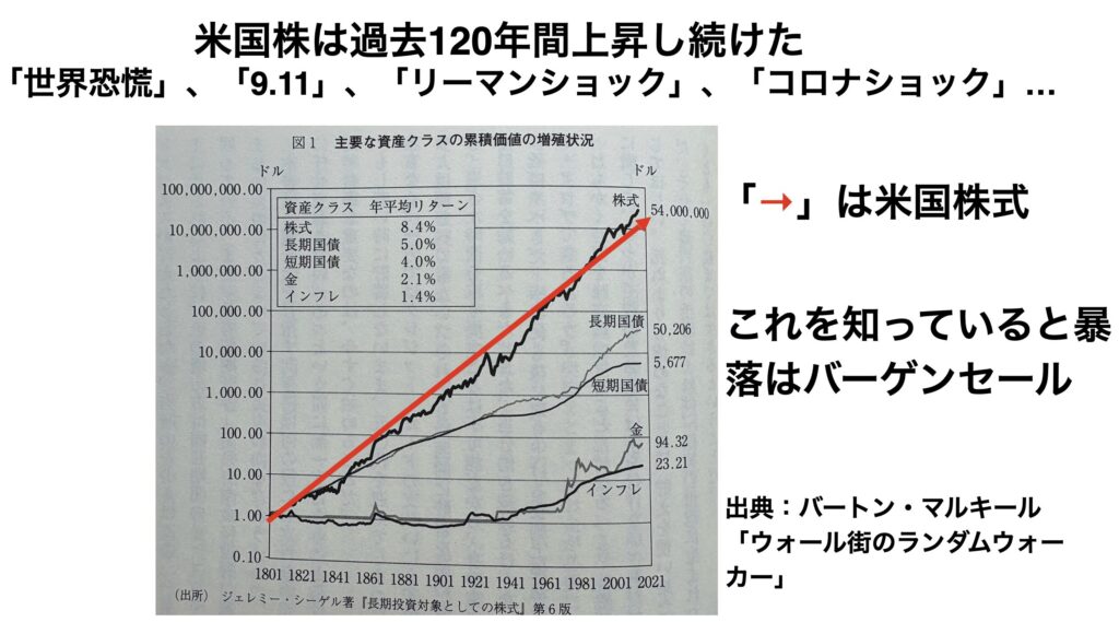 ただ、当時は約50%下落した「リーマンショック」や約30%程度下落した「コロナショック」を乗り越えて今があります。