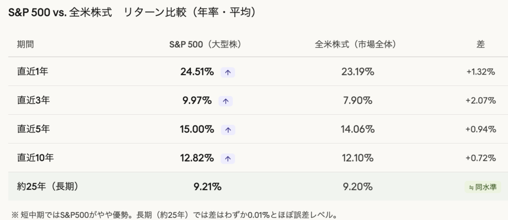 全米株式とS&P500のリターン差は、長期ではほぼ誤差レベルです。