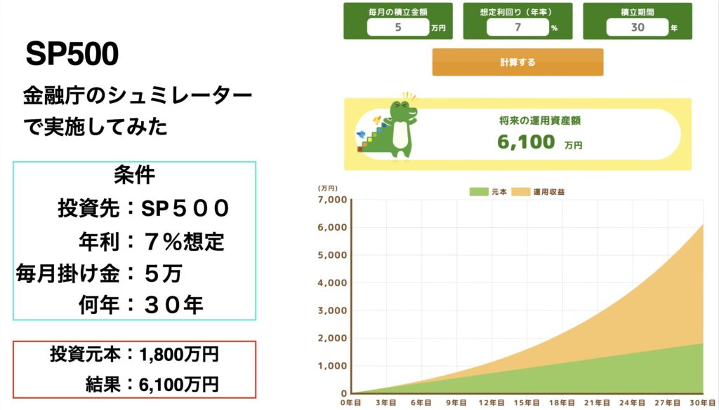 まとまったお金がない想定で、月5万円ずつドルコスト平均法で30年積み立て投資をしていきます。