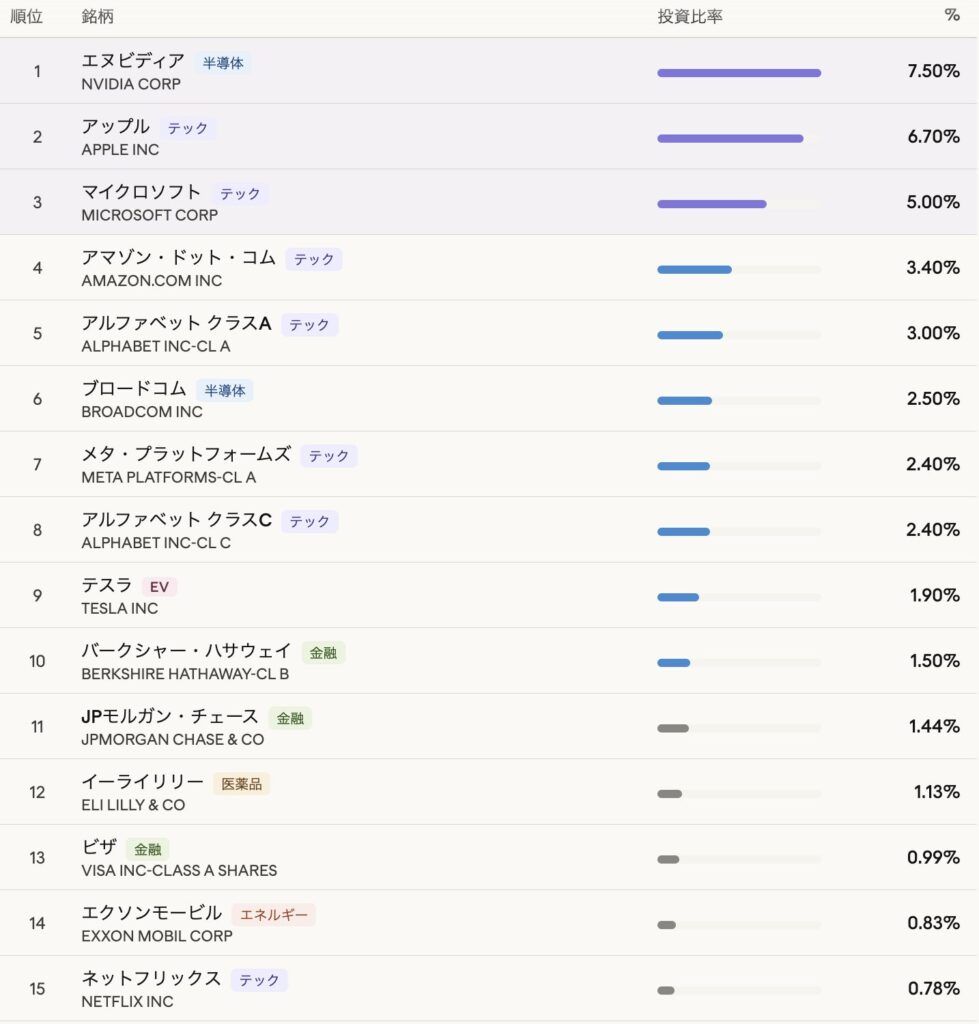 単純に500社を均等に足し合わせるのではなく、会社の規模(時価総額)が大きいほど指数への影響が大きくなる仕組みです。そのため、エヌビディアやアップルなど上位数社の動きが指数全体を左右します。上位15社だけで約34%を占めているのはその表れです。
