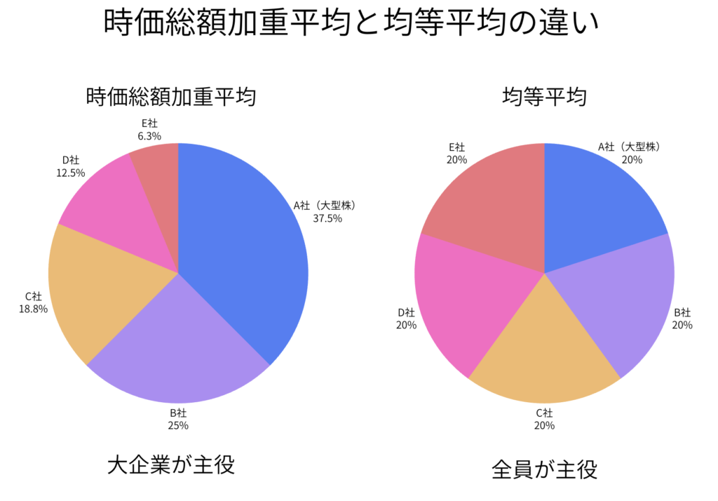 時価総額加重平均と均等平均の違いはこの表をみると一目でわかります。