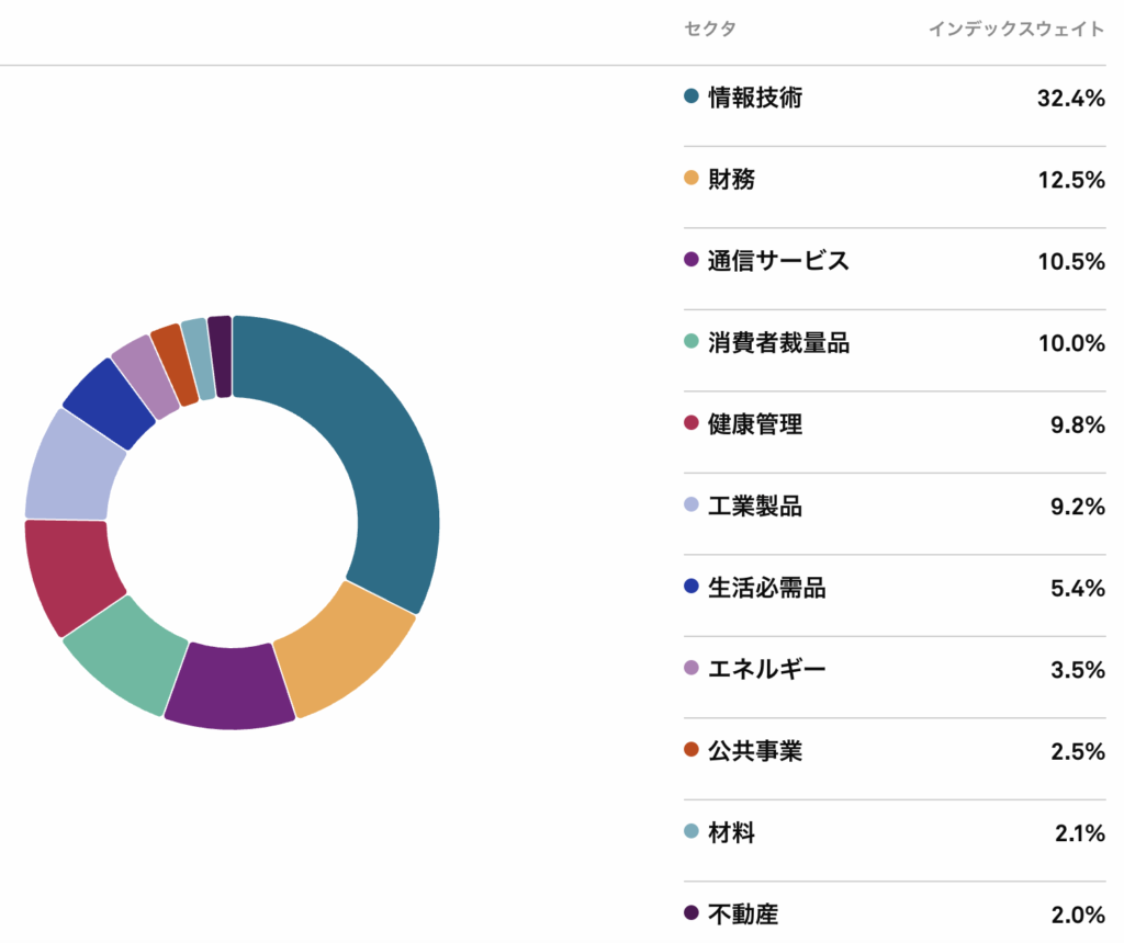• ITセクターへの偏重: 現在のS&P 500は、情報技術(IT)セクターの比率が約30%超と非常に高くなっています。そのため、ハイテク株バブルの崩壊などの事態が発生すると、指数全体が深刻なダメージを受ける構造になっています。