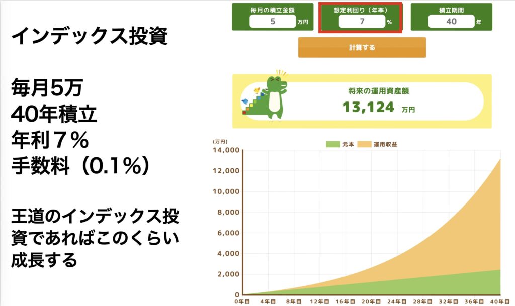 毎月5万円を40年積み立て続けると1億3千万円になると推測できるわけです。
