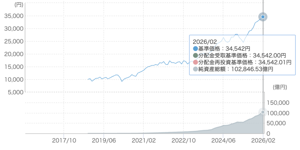 こちらのチャートはeMAXIS Slim 全世界株式(オール・カントリー)という全世界3,000社に投資する投資信託なのですが、上の表の通り、2018年10月から2026年2月までの7年半で3.4倍に資産が増えています。